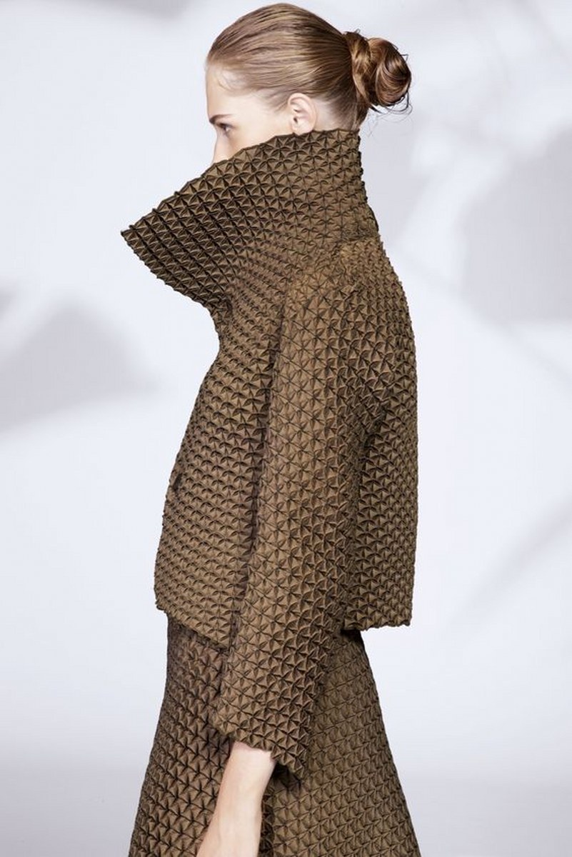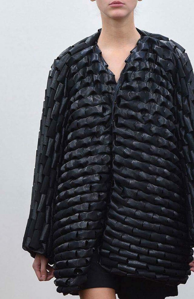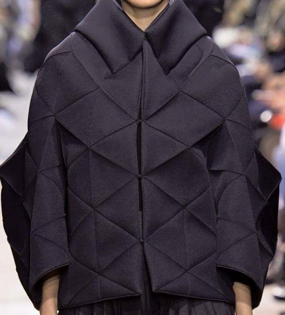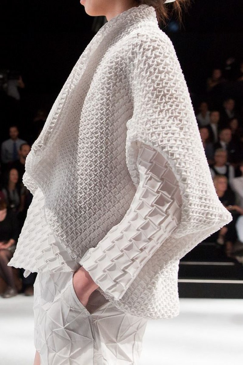 Футуристичният тренд също така повелява наличие на релеф, гънки и триизмерни форми. Всичко това с уговорката за запазване на минималистичността на моделите, защото всичко, претрупано в този стил, има потенциала да изглежда гротескно и не толкова стилно .