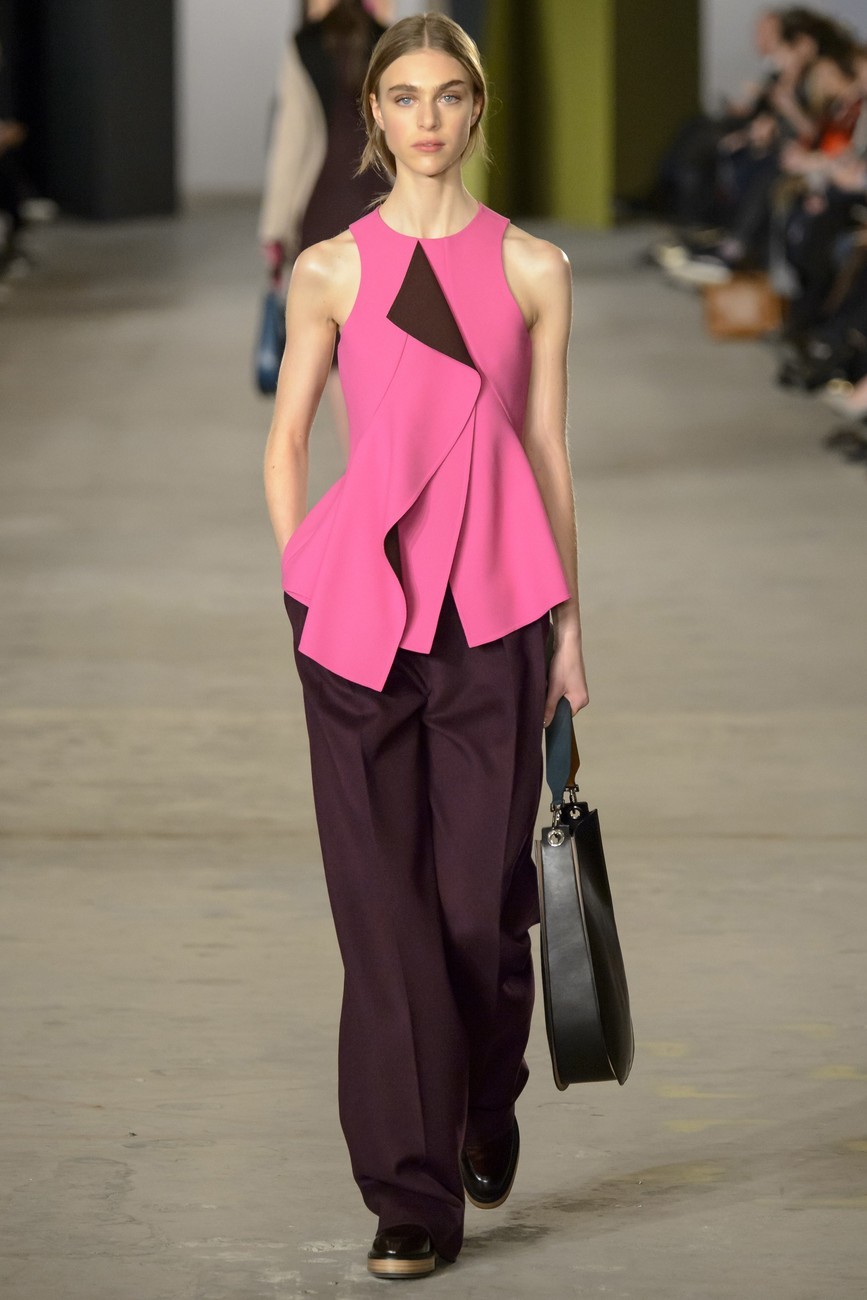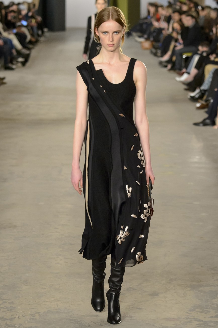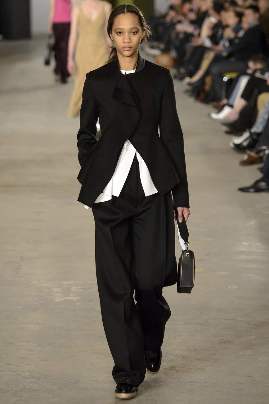 И все пак, има една взискателност към подход на Ву. Скулптурираност в кройките и вълнообразни детайли, миксирани кожа и велур, носят архитектурна точност, но изпълнени чисто и с микро-прецизност. Същото важи и за змиевидните ленти от коприна, облицовани в рокли от вълна, или вълнообразните ивици от многоцветен плат, пришити върху черно поло.