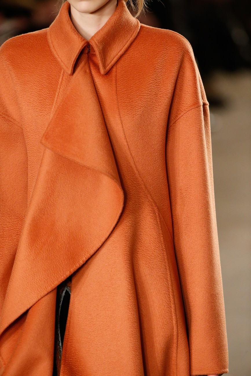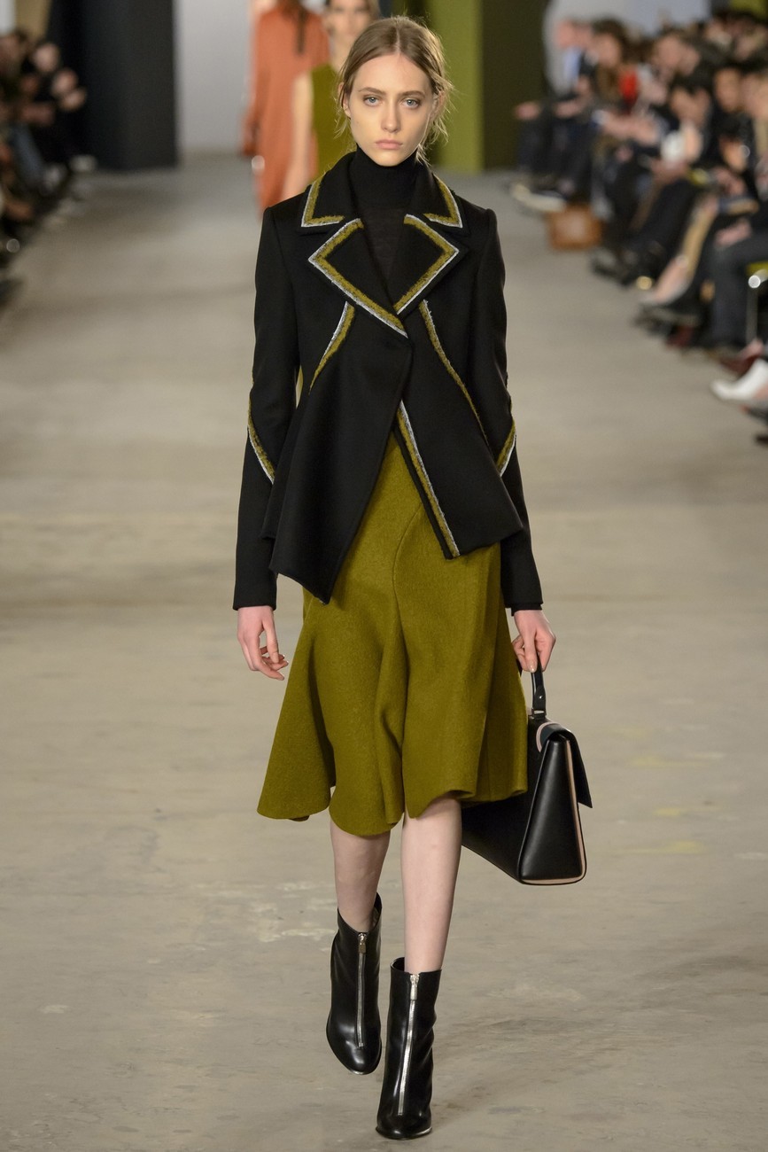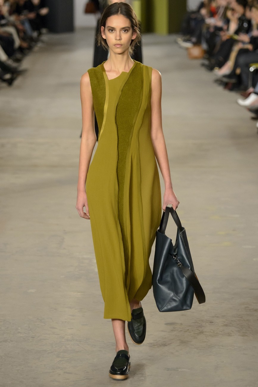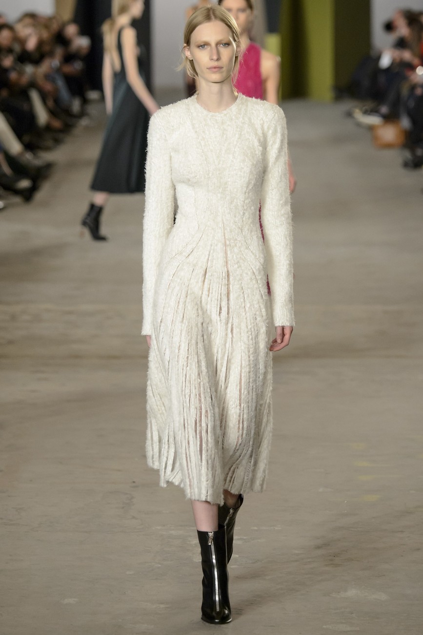 И все пак, има една взискателност към подход на Ву. Скулптурираност в кройките и вълнообразни детайли, миксирани кожа и велур, носят архитектурна точност, но изпълнени чисто и с микро-прецизност. Същото важи и за змиевидните ленти от коприна, облицовани в рокли от вълна, или вълнообразните ивици от многоцветен плат, пришити върху черно поло.