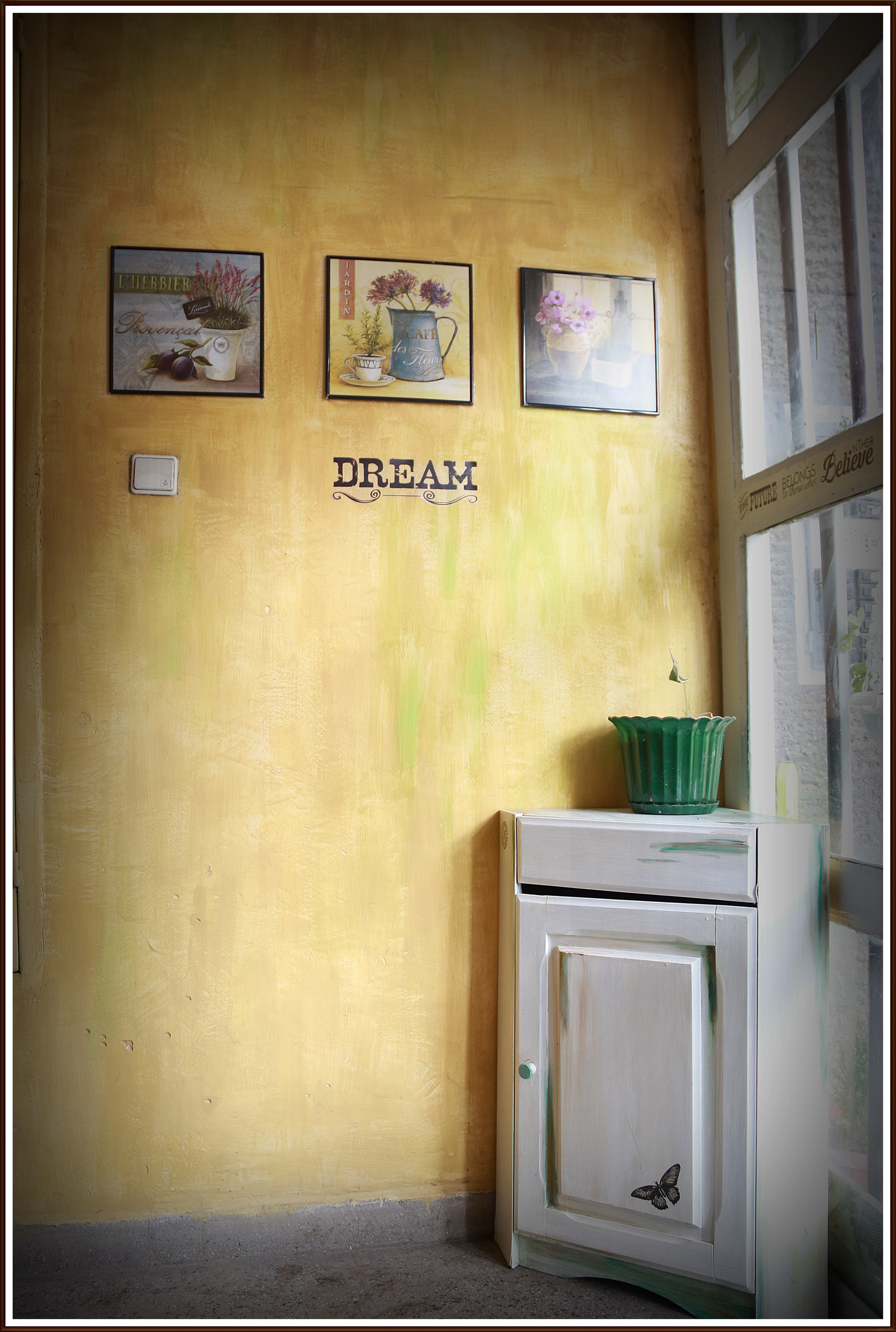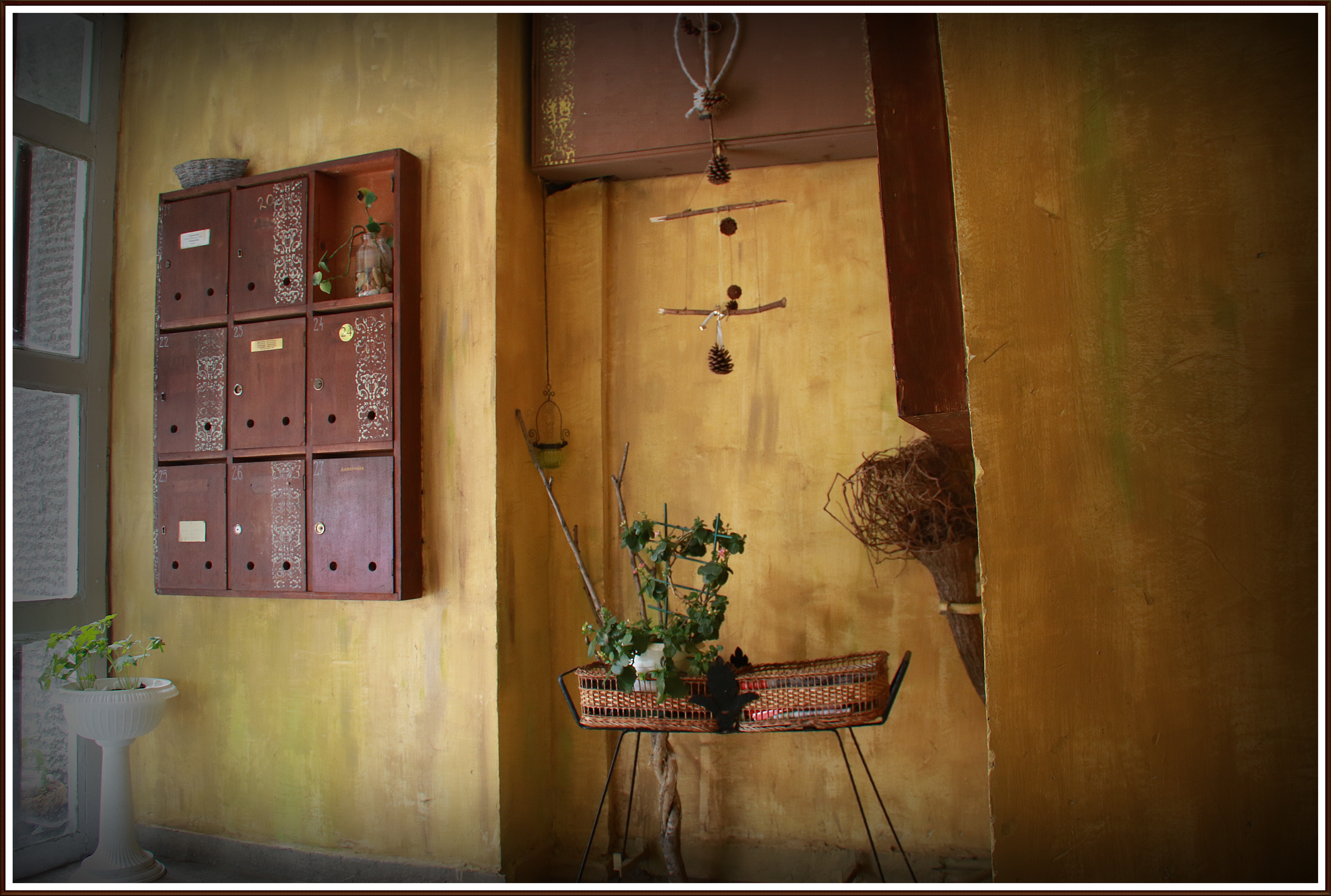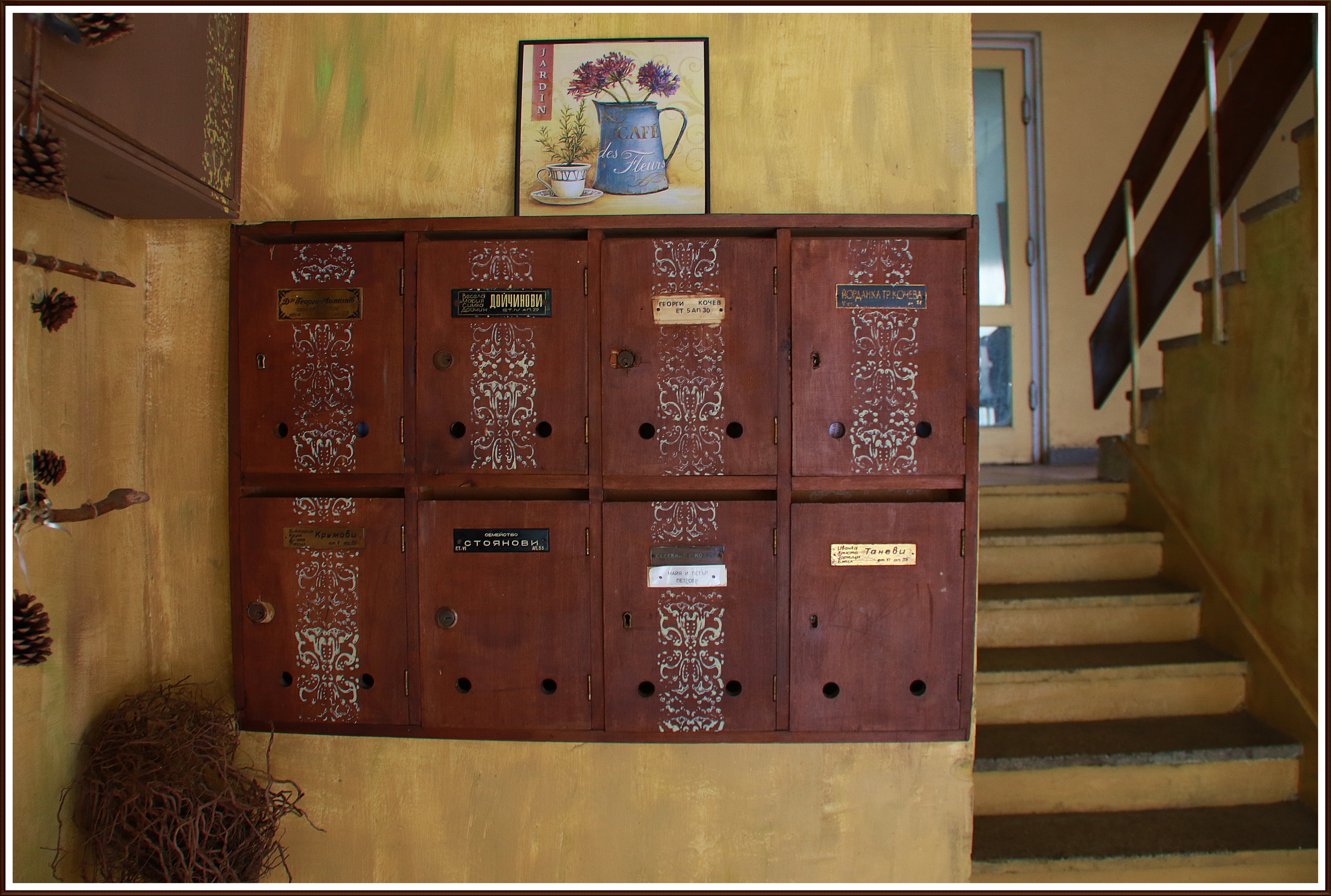 Входа от много време исках да го преправя, но досега нямах време. Няма някакъв дълбок подтик, просто обичам да ми е красиво и обичам да работя с ръцете и въобръжението си. Някак си сме свикнали общите части в блоковете да са грозни и мръсни, защото не са на никого. Минаваме набързо, присвиваме поглед, защото е занемарено и грозно и се прибираме вкъщи. А не е нужно да е така. Те са част от дома ни. Ето защо реших да преправя входа, за да стане уютен като дом, да е по-различен и красив. Да се види, че общото също може да носи душата на обитателите в даден блок. Сложих картини, цветя…дори перде…защо не..стана много интересно 🙂 Една сутрин съседът от 6-тия етаж дойде , докато си работех и ми каза: „Искам да сложа една масичка и сутрин да си пия кафенцето тук.“ 🙂
